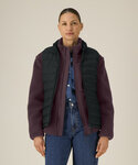 100% Recycled nylon. Women’s bodywarmer. Fitted. Sleeveless. High collar. Reverse nylon zip at centre front. Zipped welt pockets with extra grosgrain puller. Elastic tape binding at the armhole. Fully quilted. Side panels for a better shape. Inside seams with binding finish. Bottom hem has an adjustable plastic stopper and elastic cord.